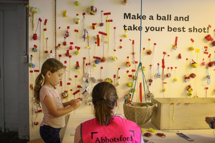 We met up there with a friend and her three year old daughter for a Sensory Art Lab program that ran throughout the month of January. It was a completely FREE drop-in space with different rooms and activities. As you entered there was a table set up with various bits of string, paper and tape where you could make a ball to then blast off in a DIY catapult. There were hoops you could aim the balls through, but that was a bit above the skill levels of our two kiddos.