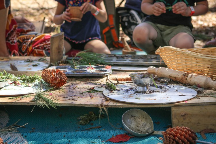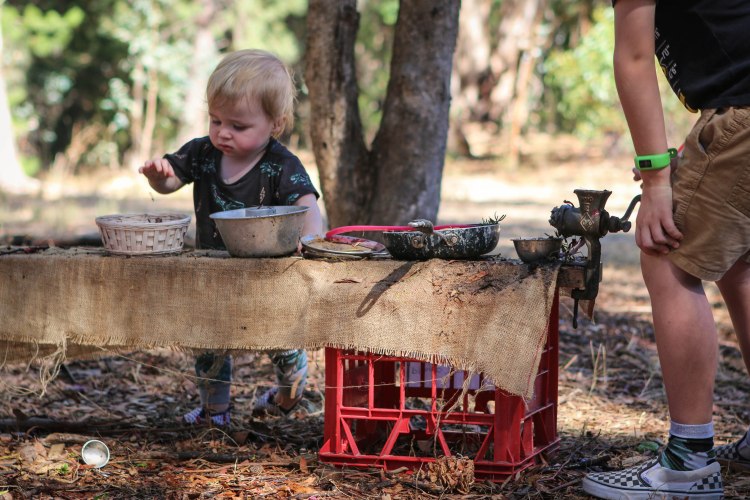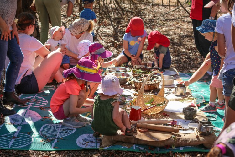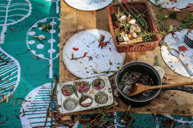 By far my favourite area, though, was the huge mud kitchen space. There were several tables simply set up on outdoor rugs, but laid out with beautiful materials – baskets full of flowers, leaves, gum nuts, pine cones and more.