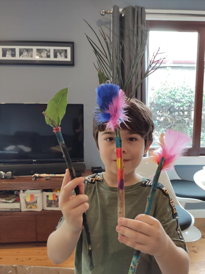 Tara’s son shows off his homemade “Featherwand“.