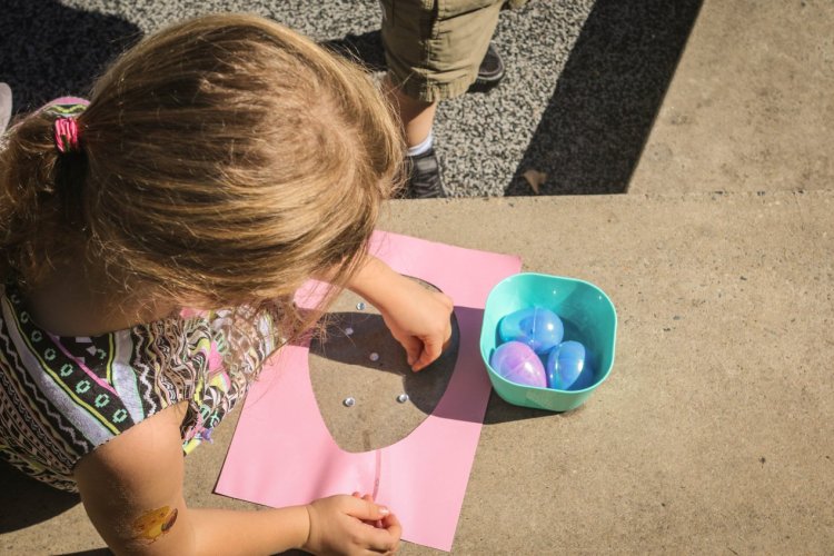 Then we cut egg shaped holes into a piece of paper and added a piece of contact paper where the kids could use their supplies to decorate the eggs. We repeated it the following year for my kids and their friends in a nearby park.