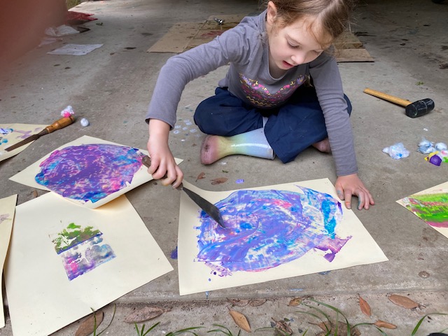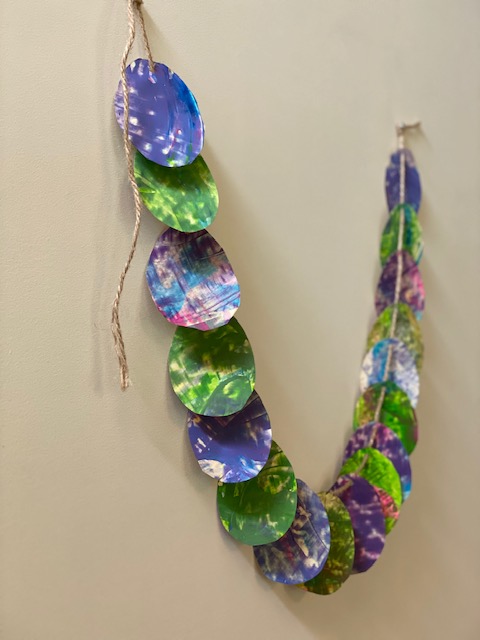 When we did our Hammerbarn day Luella discovered this awesome technique using a paint scraper to make psychedelic patterns. Yesterday we cut them out and strung them into an Easter garland.