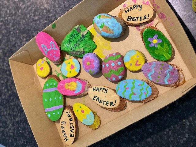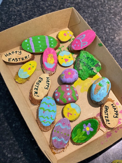 This week Luella and I painted these wood slices and some stones and decorated them with Easter messages. We’re going to leave them around the neighbourhood for people to find. (As was part of our Neighbours day)