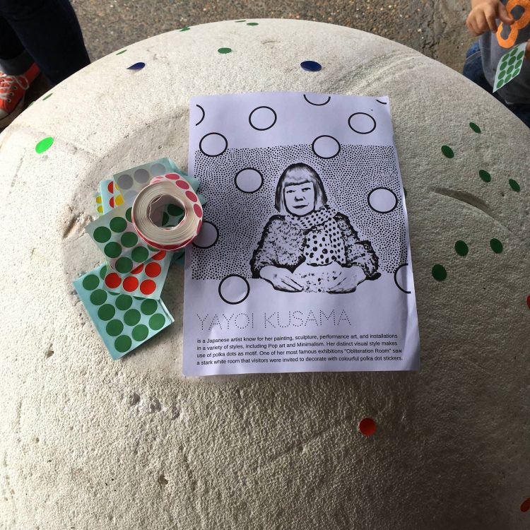 For our Kusama-inspired project we gathered heaps of coloured dot stickers. We weren’t sure what we were going to decorate with them (Kusama famously created the interactive “obliteration room“). But Reverse Garbage who had donated a number of our supplies for the event, happened to have this giant white styrofoam ball, which fit the bill.
