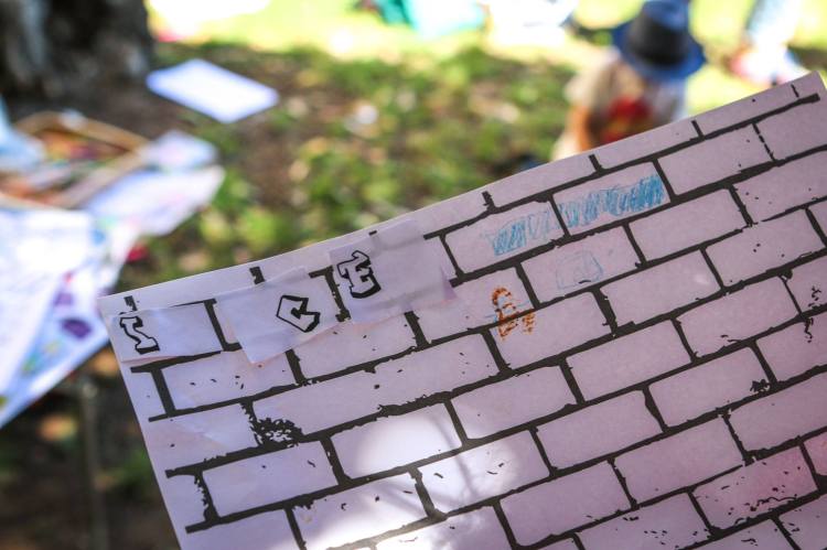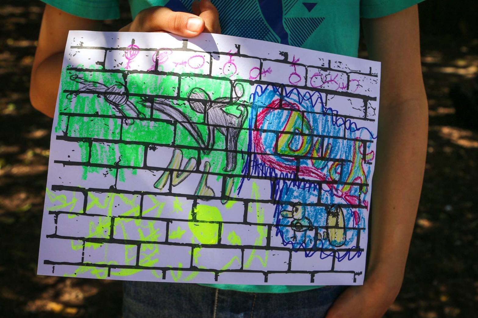 After comparing what everyone found and talking about the art we’d seen we chatted about “tagging” and looked at some examples in a street art book of different tags, recurring elements or images that street artists use to distinguish themselves. I handed out simple sheets with a black and white brick wall for the kids to create their own artworks on.
